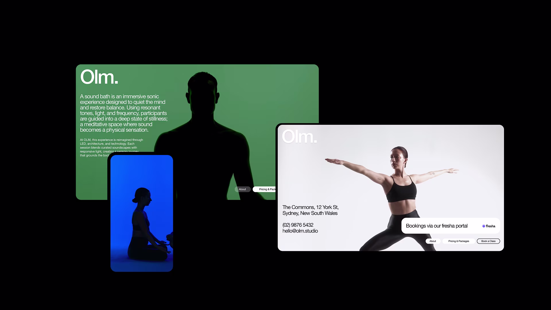 The Olm Studios website is designed to reflect the immersive, LED-driven sound bath experience. I focused on creating a sleek, bold interface that mirrors the studio’s visual identity, combining neon-inspired accents with high-quality videography and Swiss typography for a modern, premium feel.